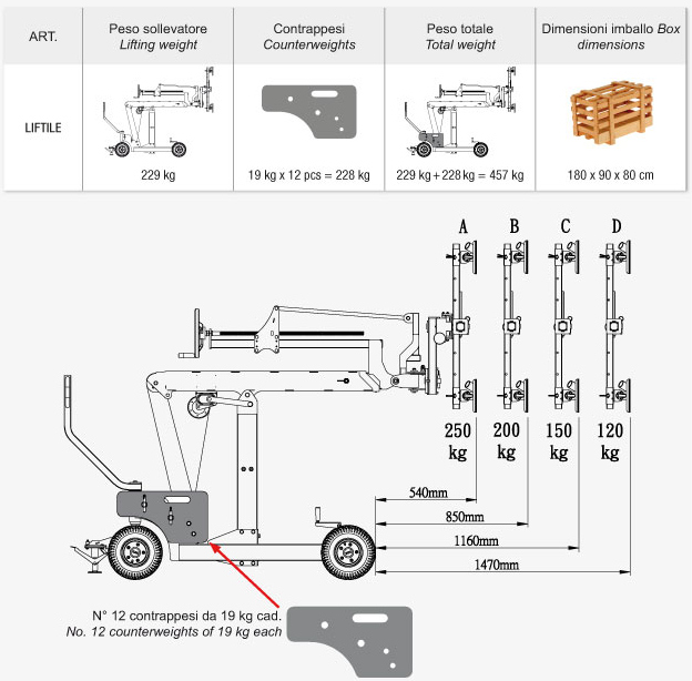 Liftile - це інноваційна колісна система, здатна обробляти надзвичайно легкі плити до 250 кг на максимальній висоті 2,5 метри. Цей інструмент оснащений 8 твердими присосками з вакуумною системою безпеки, вільно рухомими за необхідністю, система може бути легко керована одним працівником. Цей дивовижний інструмент може знімати, переносити і закріплювати плиту безпосередньо на робочих місцях. Принцип ручної праці та відсутність необхідності в електроенергії робить цей інструмент найпростішим і, одночасно, професійним способом роботи з плитами в будь-якій ситуації.