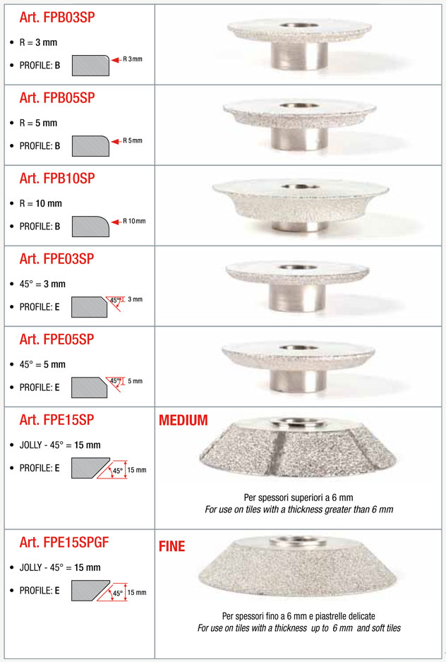 Існує широкий діапазон алмазних інструментів, які можна використовувати з машиною для формування краю плитки SUPER PROFILE. Нижче наведено технічний лист з інформацією про ці інструменти та результати, які вони дозволяють досягти: